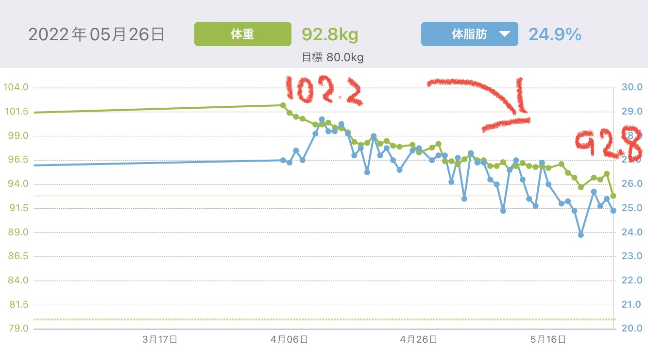 今年の4/5 不覚にも102.2キロあった体重は 5/26の段階で92.8キロまで落とすことが出来ました。